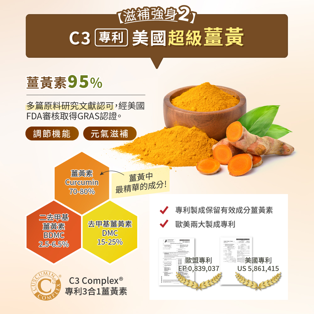 ⭐C3美國專利超級薑黃素:含薑黃素95%,多篇臨床研究文獻認可,美國專利製程的高品質薑黃素,能調節機能、讓身體元氣滋補。