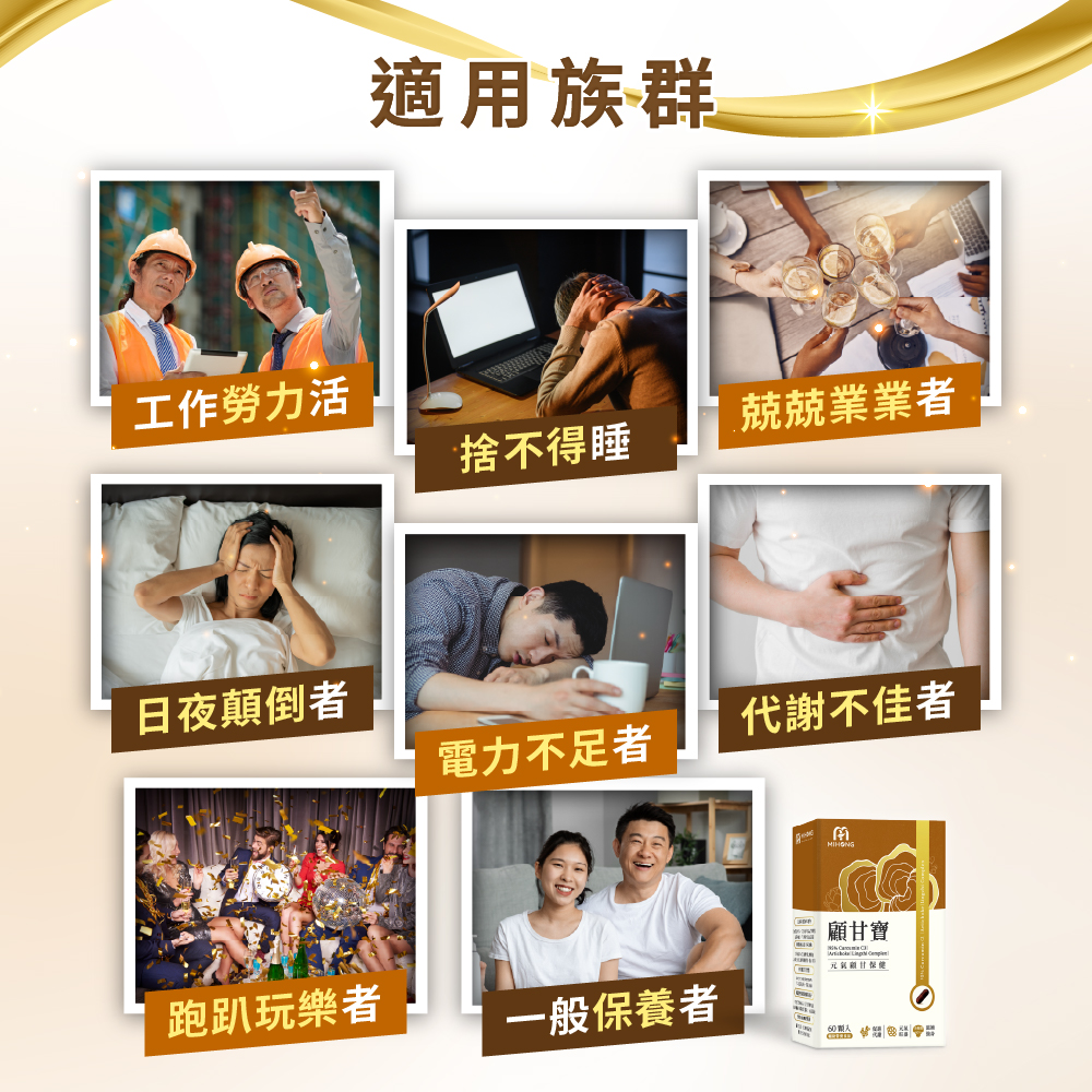 A.:聚會多丶體力活工作、工作超時、作息不正常丶捨不得睡、跑趴玩樂、體力不佳者都很推薦! 沒有異常作息,年紀處中高齡者,也都相當推薦食用顧甘寶當作日常保養。