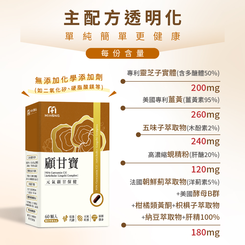 商品成分:C3薑黃萃取物、五味子萃取物、赤芝子實體萃取物(Ganoderma lucidum (Leyss. : Fr.) Karst. ,固態培養)、蜆精粉、朝鮮薊萃取物、枳椇子萃取物、肝精、納豆萃取物(含維生素K)、酵母B群、柑橘萃取物(含柑橘類黃酮)
