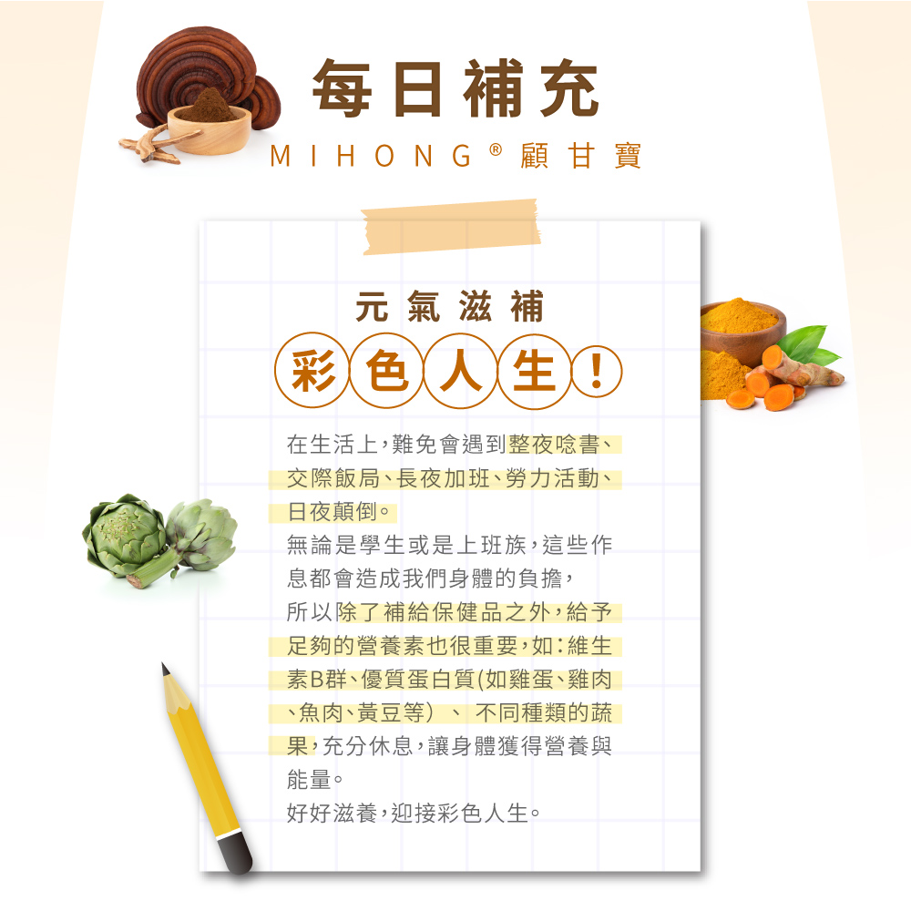 🕺這是一款幫助相聚加班、工作勞動、捨不得睡的族群們所設計的營養食品,由我們體貼你的辛苦,並好好愛自己,幫助元氣旺盛、滋補強身、營養補給、促進代謝 、調節生理機能、五大機能使你迎接彩色人生,做你最安心的後盾!