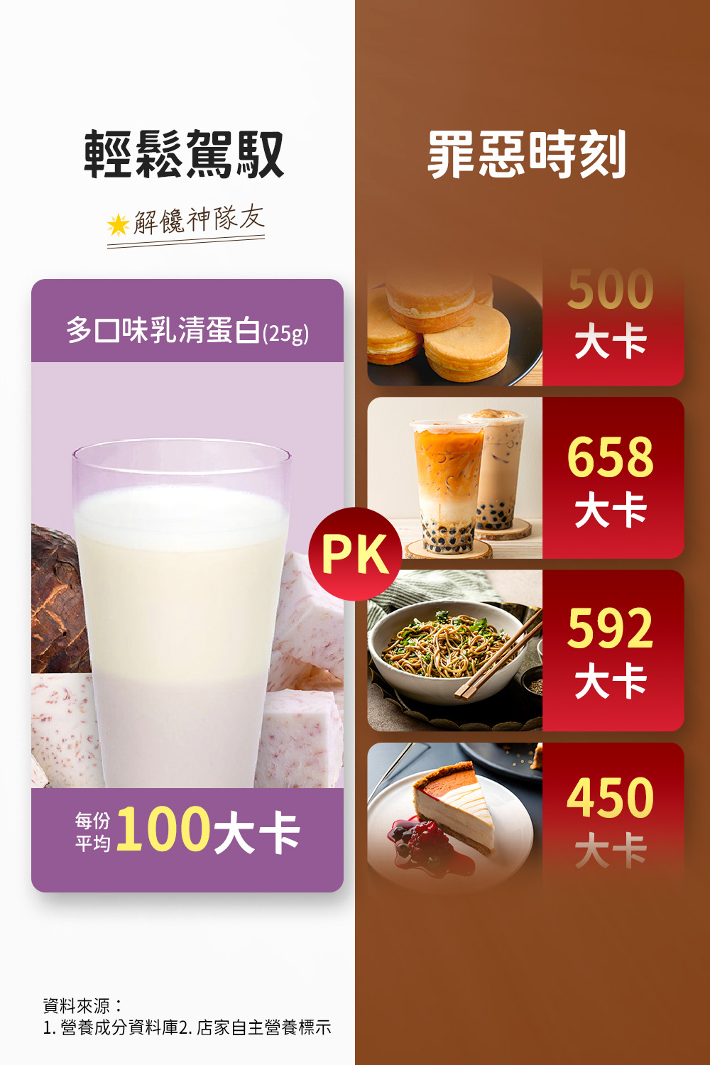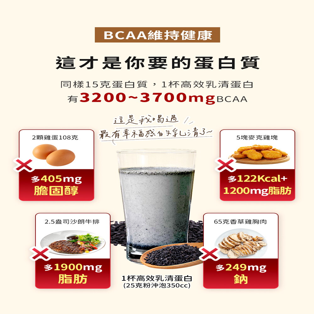 黑糖奶茶:乳清蛋白(濃縮乳清蛋白、分離乳清蛋白、卵磷脂)、黑糖粉、全脂奶粉、紅茶粉、關華豆膠、鹽、二氧化矽、甜味劑(醋磺內酯鉀、蔗糖素)
