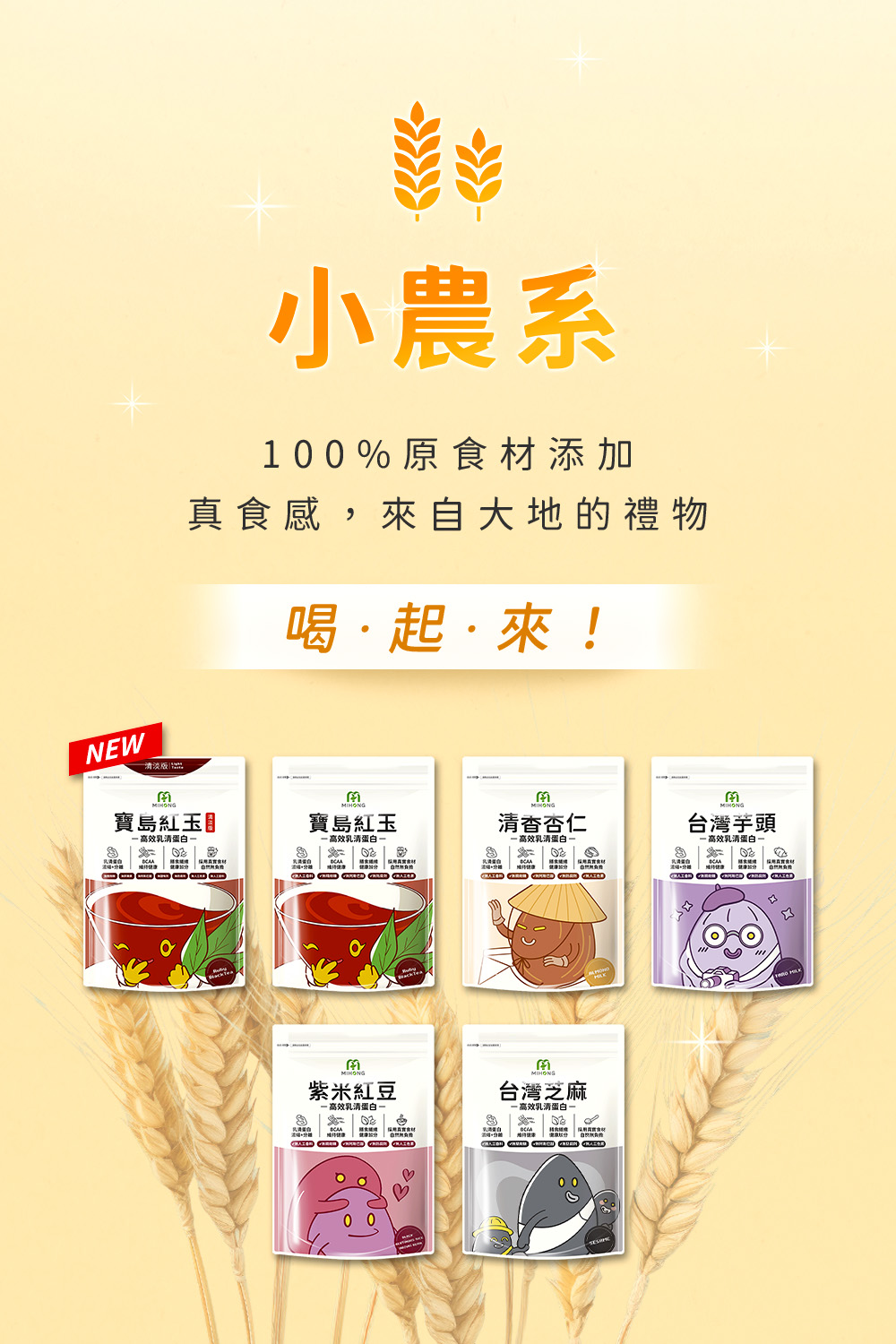 MIHONG®多口味高效乳清蛋白.主打分離+濃縮的優質乳源形式;MIHONG®多口味高效燕麥奶,主打水解+分離的燕麥奶植物蛋白形式,承襲無調味經典的多口味選擇;MIHONG®高效乳清蛋白-限量系,主打水解+分離的優質乳清與分離大豆蛋白結合,經研發不斷改良,無添加香料、色素,美味百卡的飽足小農蛋白飲,集健康與美味於一杯-補充一天蛋白質所需,從高效乳清蛋白開始-好喝的蛋白質,可用於肌肉生長,幫助調整體質,營養補給!