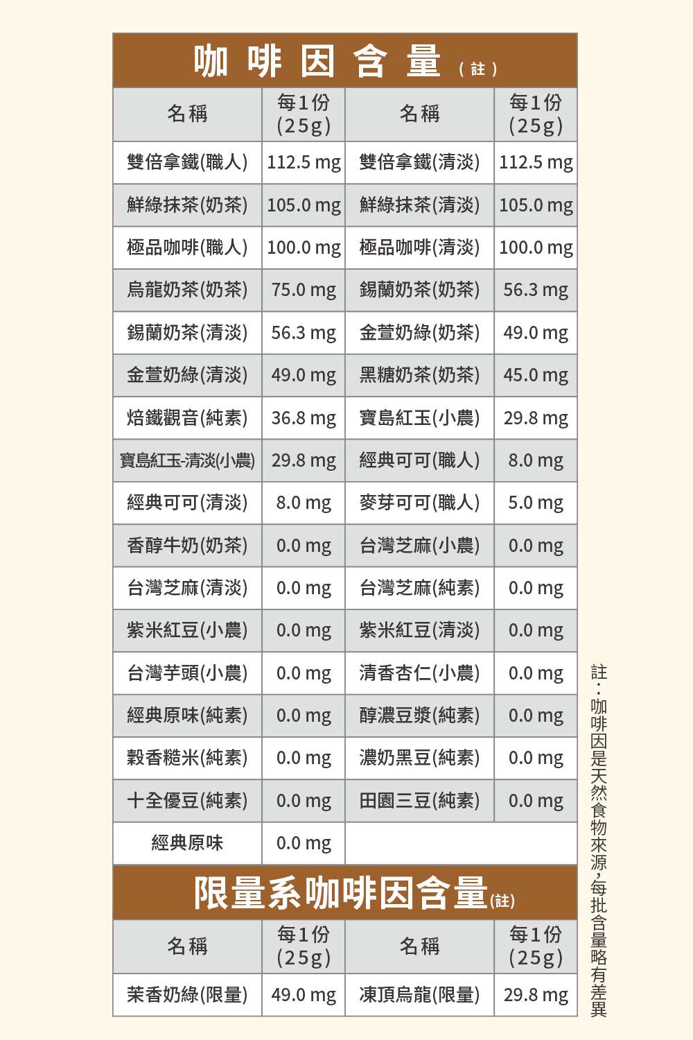 焙鐵觀音(燕麥奶):分離大豆蛋白(含卵磷脂)、水解燕麥粉、玉米來源可溶性纖維、鐵觀音茶粉、椰子油粉(椰子油、葡萄糖漿、辛烯基丁二酸鈉澱粉、磷酸鈣)、關華豆膠、二氧化矽、甜味劑(醋磺內酯鉀、蔗糖素)