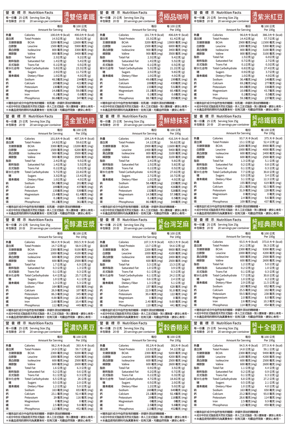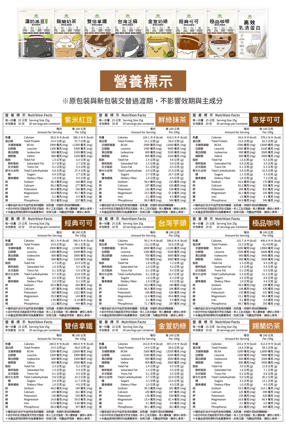 茉莉奶綠(限量系):即溶乳清蛋白(濃縮乳清蛋白、分離乳清蛋白、大豆卵磷脂)、全脂奶粉、分離大豆蛋白(含大豆卵磷脂)、茉莉綠茶粉、玉米來源可溶性纖維、關華豆膠、二氧化矽、甜味劑(醋磺內酯鉀、蔗糖素)