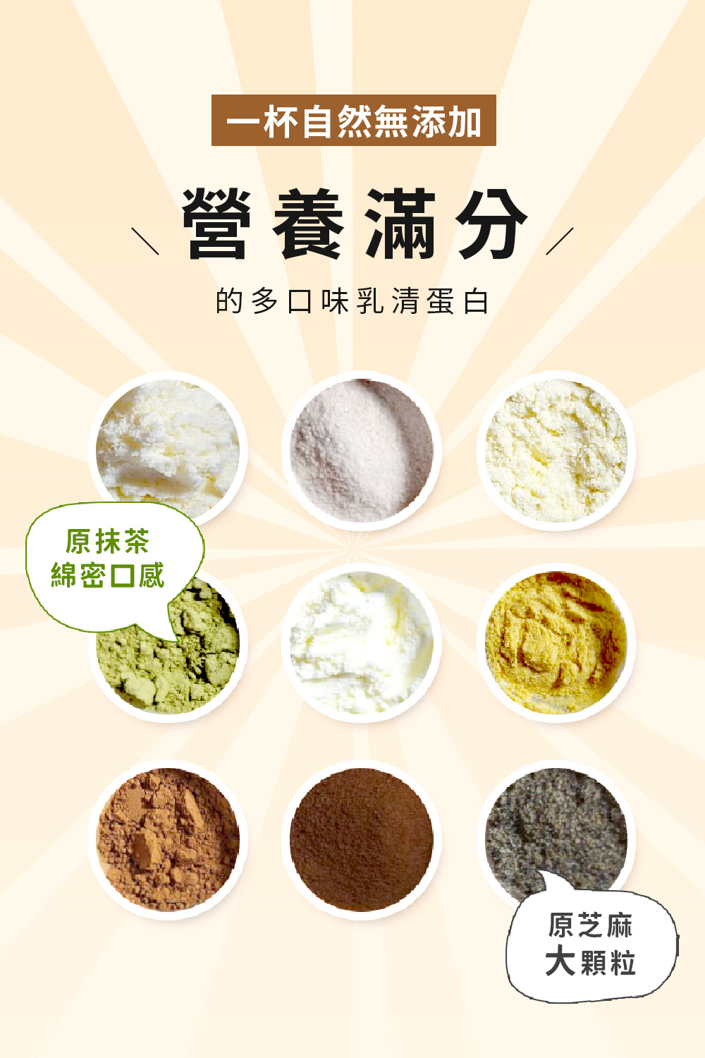 台灣芝麻(清淡版):即溶乳清蛋白(濃縮乳清蛋白、分離乳清蛋白、卵磷脂)、芝麻粉、全脂奶粉、玉米來源可溶性纖維、關華豆膠、二氧化矽