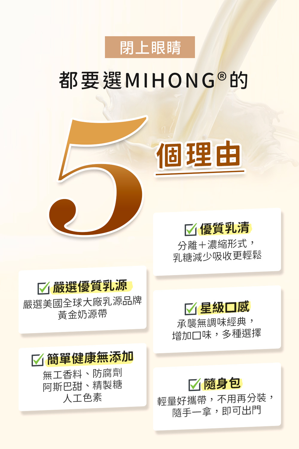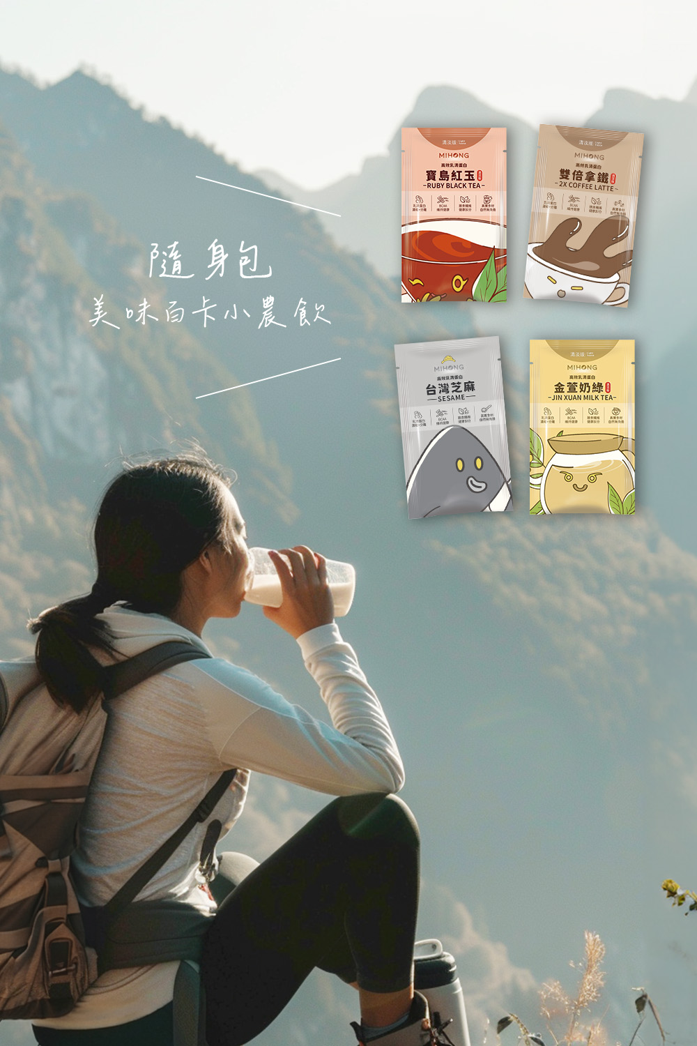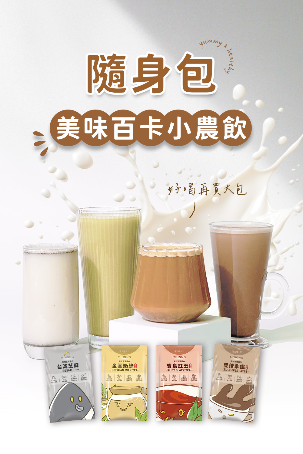 MIHONG美味百卡小農飲隨身包.主打分離+濃縮的優質乳源形式,承襲無調味經典的多口味選擇,