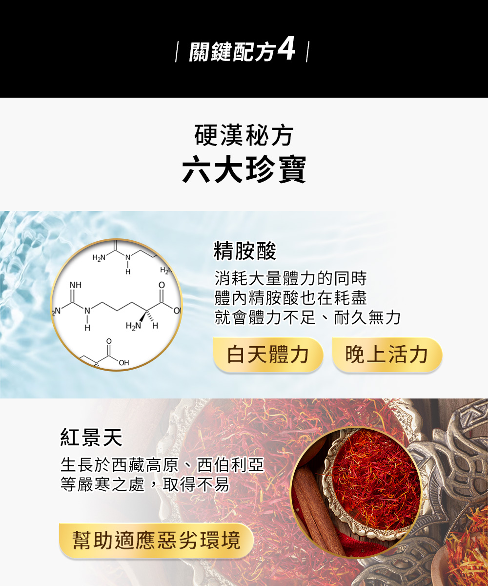 MacaPro®6:1馬卡萃取物*、L-精胺酸、酵母鋅、刺五加、啤酒酵母粉(維生素B1、維生素B2、維生素B6、維生素B12、菸鹼素、葉酸、泛酸、生物素)、透納葉萃取物、山苦瓜萃取物、薑粉、紅景天萃取物、二氧化矽、酵母硒、管花肉蓯蓉萃取物、SynForU-IU乳酸菌(植物乳桿菌、鼠李糖乳桿菌)