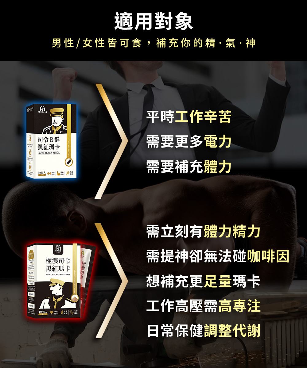 MIHONG®司令B群黑紅瑪卡採用祕魯95%高純度專利黑紅瑪卡,6倍高濃縮低溫濃縮萃取,特別添加管花肉蓯蓉以及其他自然植萃,透納葉、L-精胺酸、酵母鋅、硒酵母、山苦瓜粉、酵母B群以及草本精華,濃縮成的草本漢方食品,是最強戰力補給品。