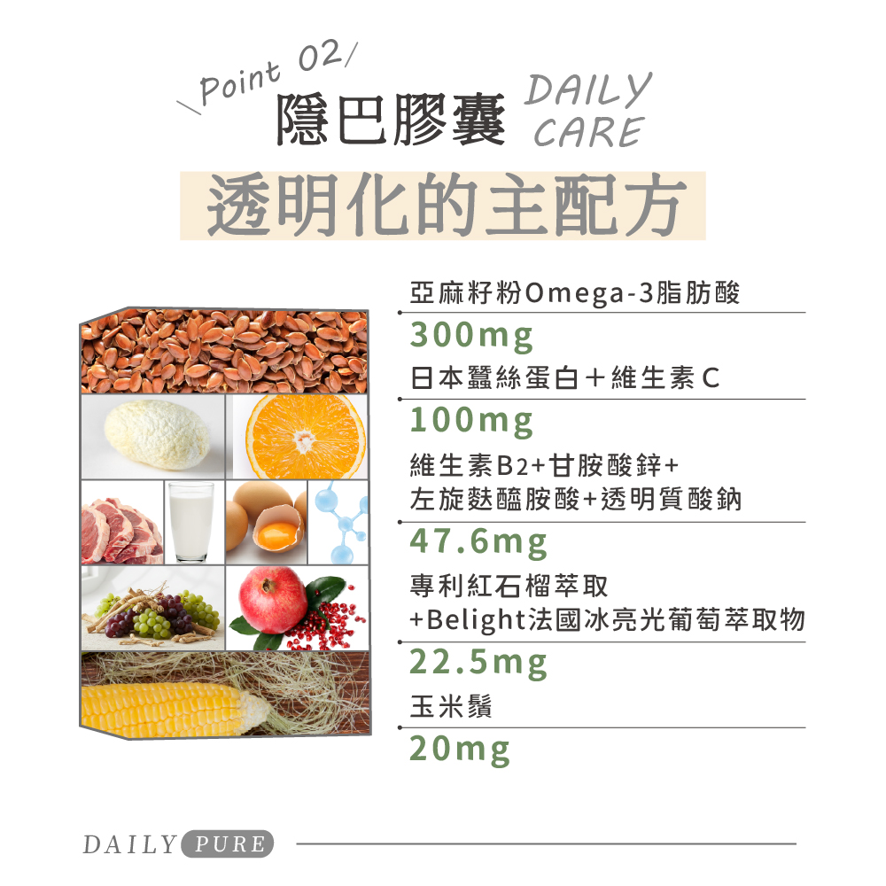商品成分:亞麻仁籽粉、蠶絲蛋白、維生素C、麩醯胺酸、玉米鬚萃取物、紅石榴萃取物、流行鏈球菌發酵物(含透明質酸鈉)、二氧化矽、微結晶狀α-纖維素、複合甘胺酸鋅(甘胺酸鋅、胺基乙酸、檸檬酸)、莓果萃取物(藍莓、葡萄、覆盆莓、木莓、蔓越莓、櫻花莓、櫻桃、野桑莓、草莓)、維生素B2