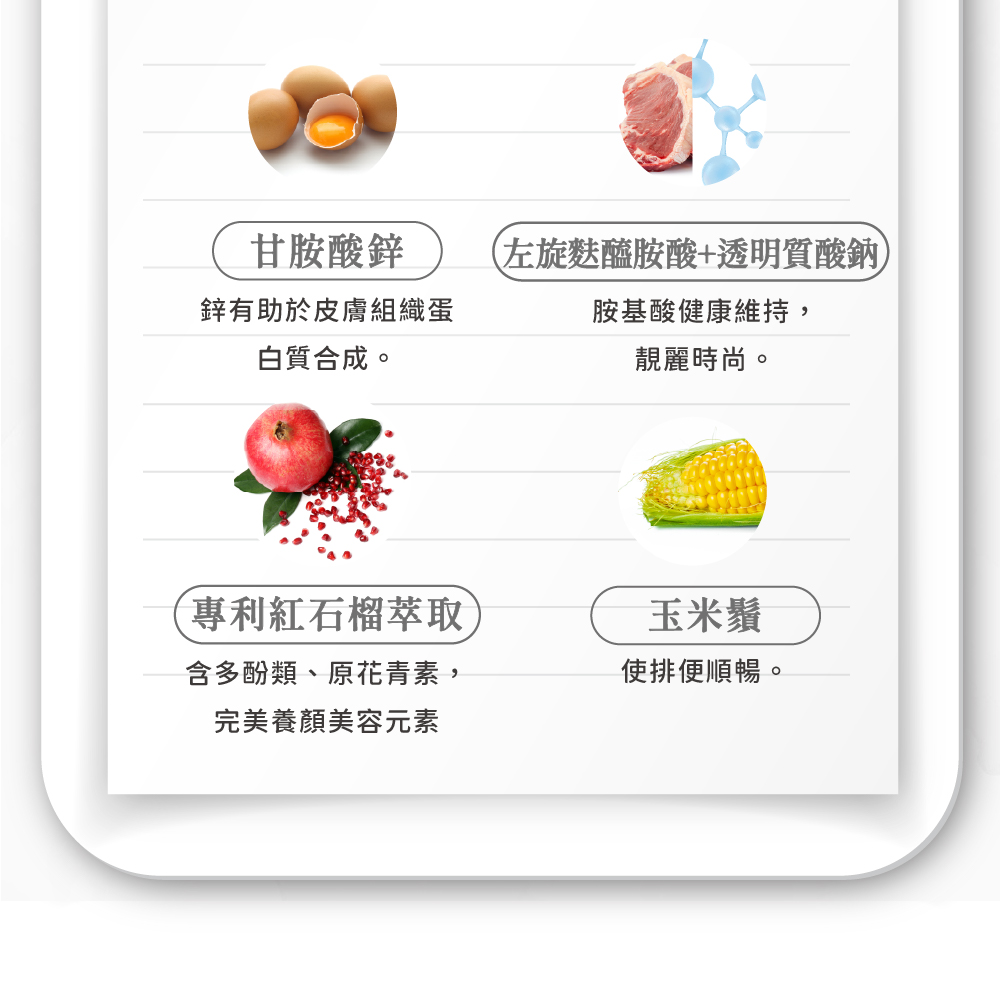 商品成分:綠茶萃取物、亞麻仁籽粉、維生素C、玉米鬚萃取物(玉米鬚萃取物、麥芽糊精)、微結晶狀α-纖維素、紅石榴萃取物(紅石榴萃取物、麥芽糊精)、流行鏈球菌發酵物(含透明質酸鈉)、複合甘胺酸鋅(甘胺酸鋅、胺基乙酸、檸檬酸、二氧化矽)、蘋果皮萃取物、二氧化矽、維生素A(乾燥葡萄糖漿、阿拉伯膠、玉米澱粉、維生素A乙酸酯、維生素 E(抗氧化劑))、維生素B6