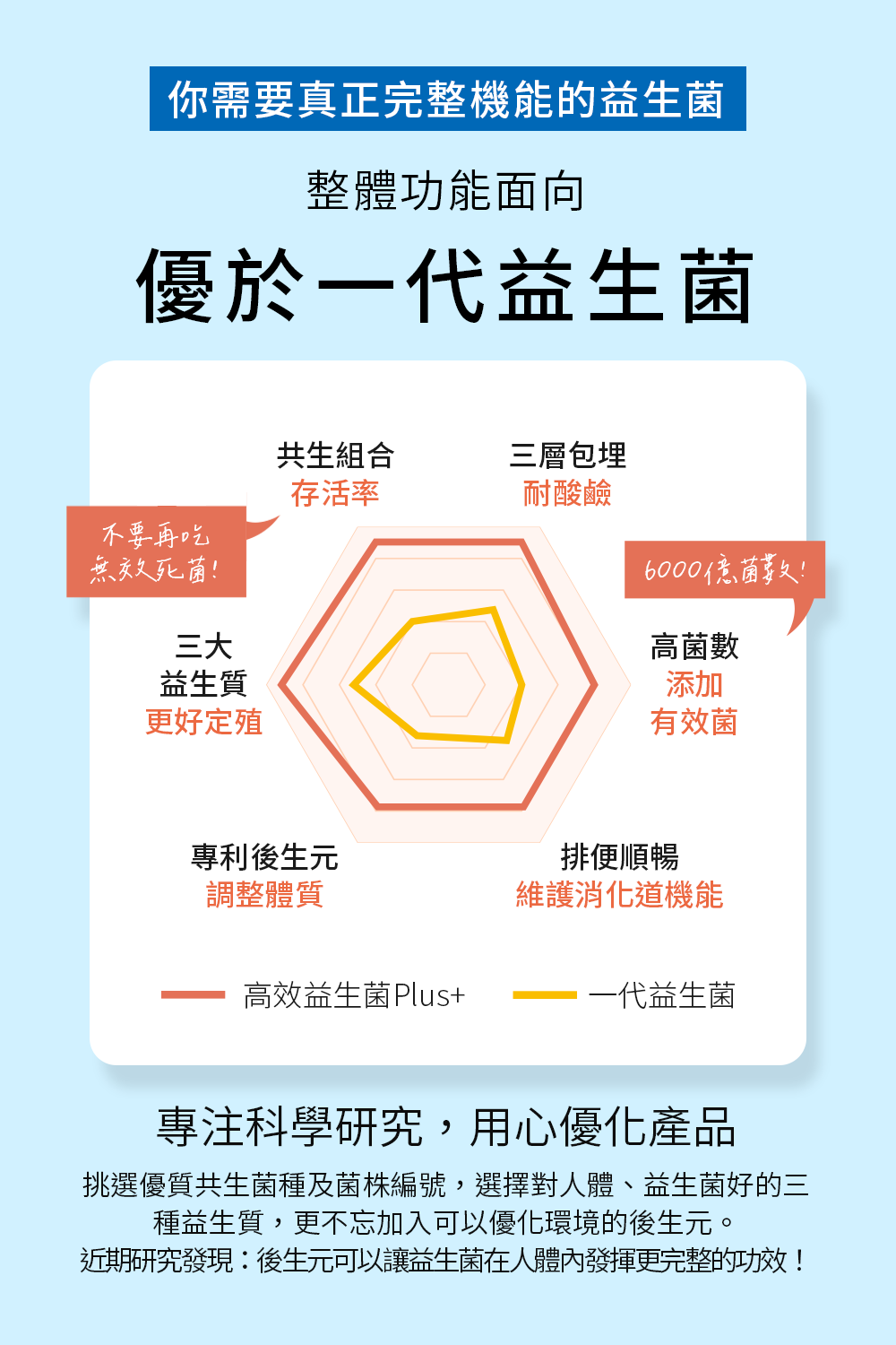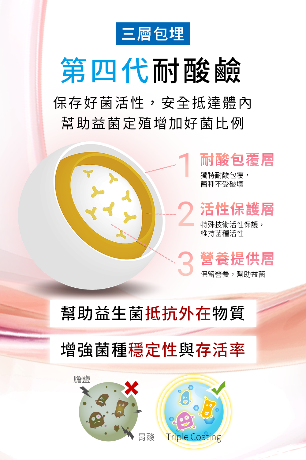 2.承襲優質益生菌->增量2倍!每盒出廠含6000億總菌數,多層包埋+第四代耐酸鹼技術,讓好菌順利抵達體內。