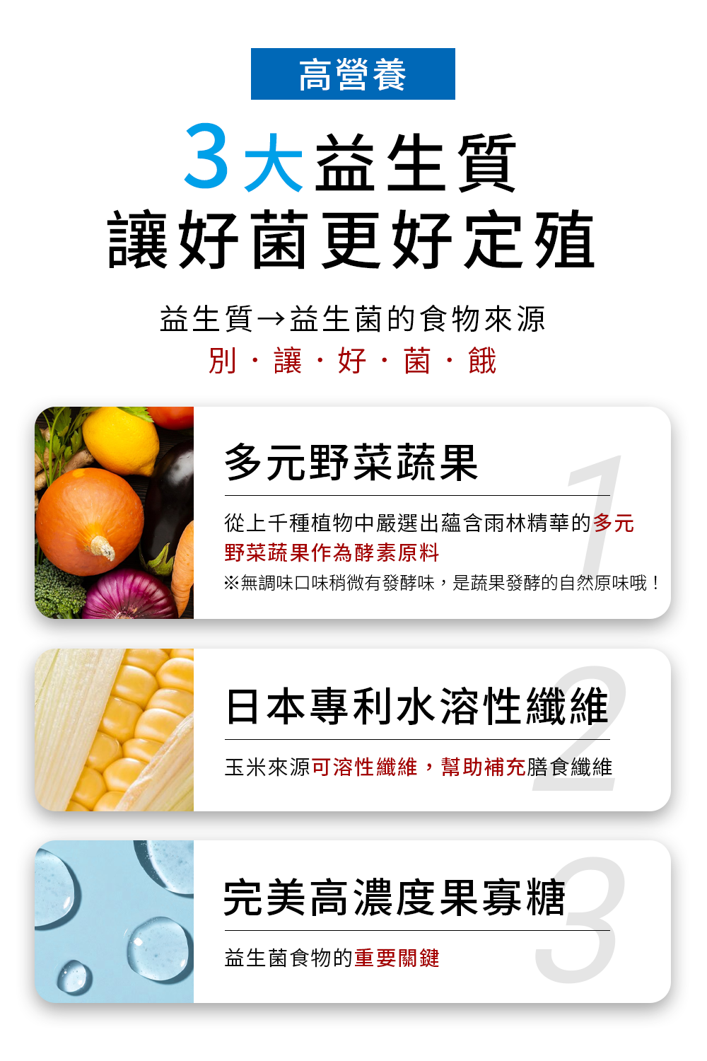 3.三大益生質增量->專利雙百大野菜蔬果+日本纖維+果寡糖.增量118%。