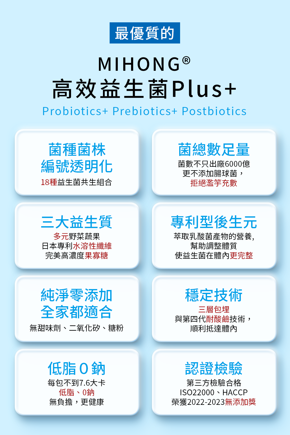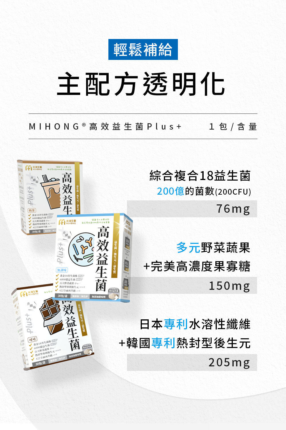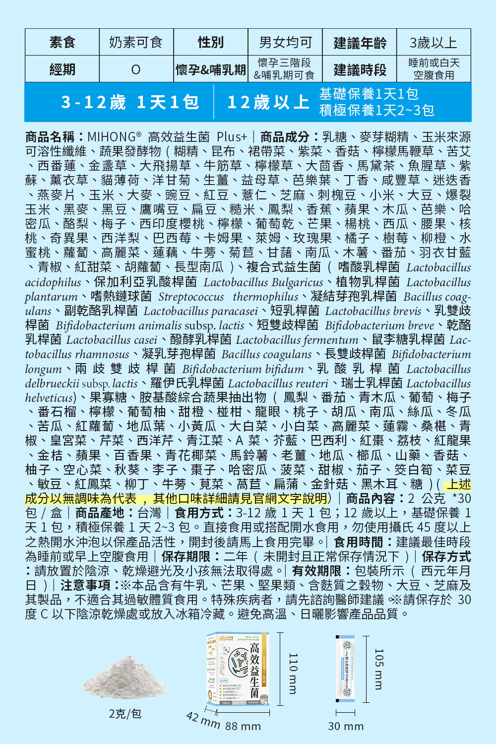 7.因菌量加倍,吃的包數可以減少, MIHONG®高效益生菌Plus+,基礎保養1包,積極保養2-3包。