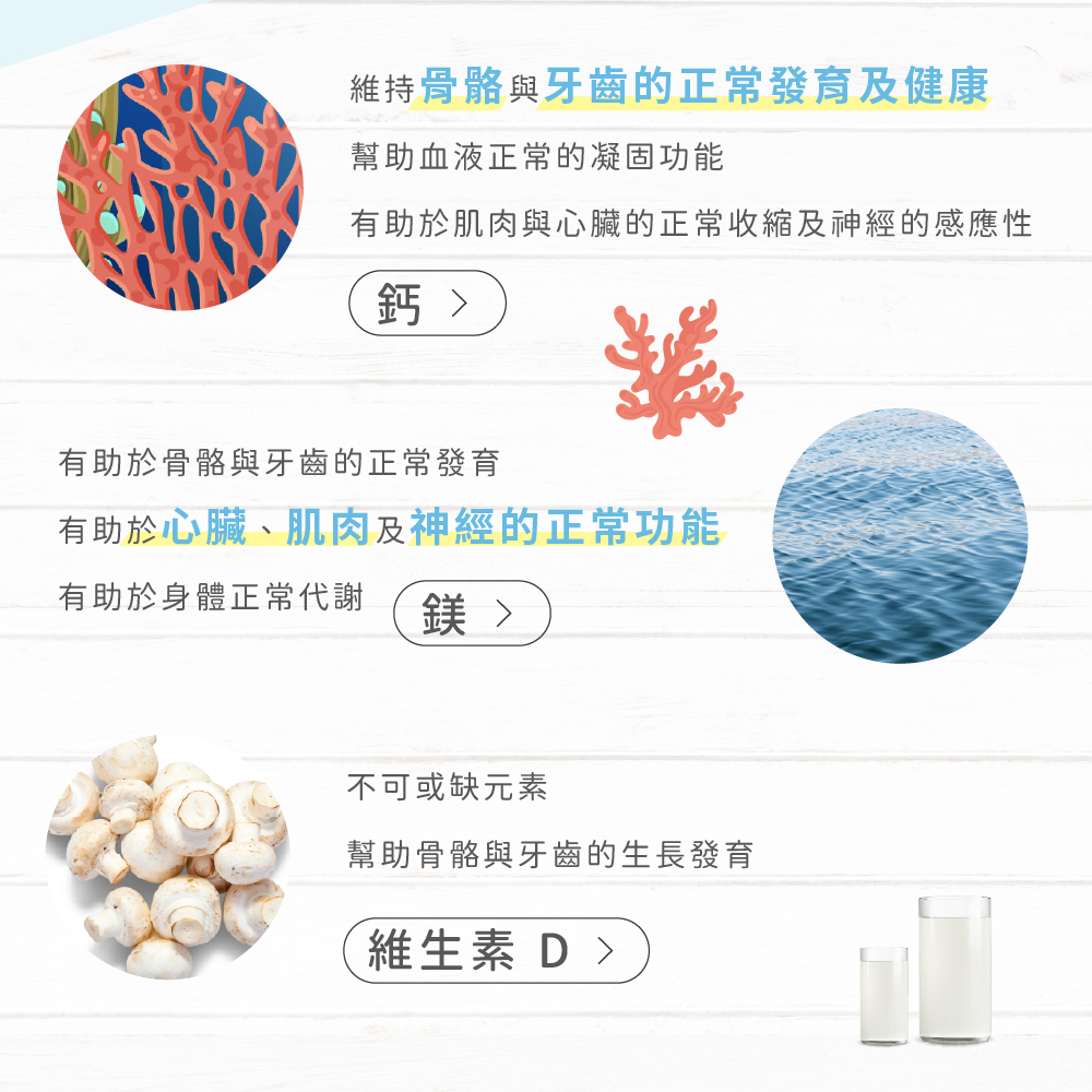 營養標示:每一份量1公克,本包裝含30份。每份(熱量 1.2大卡,蛋白質0.2公克,脂肪0公克,飽和脂肪(酸) 0公克,反式脂肪(酸) 0公克,碳水化合物 0.1公克,糖 0公克,鈉 1毫克,鈣224毫克,鎂113毫克)。每日參考值(熱量2000大卡、蛋白質60公克、脂肪60公克、飽和脂肪18公克、碳水化合物300公克、鈉2000毫克、鈣1200毫克、鎂390毫克)。每日參考值百分比(0.1%、0.1%、0%、0%、*、0.1%、*、0.1%、18.7%、29%)。*參考值未訂定。