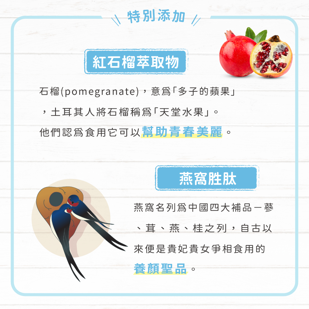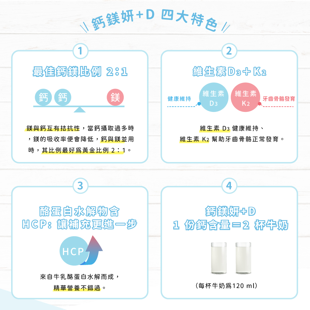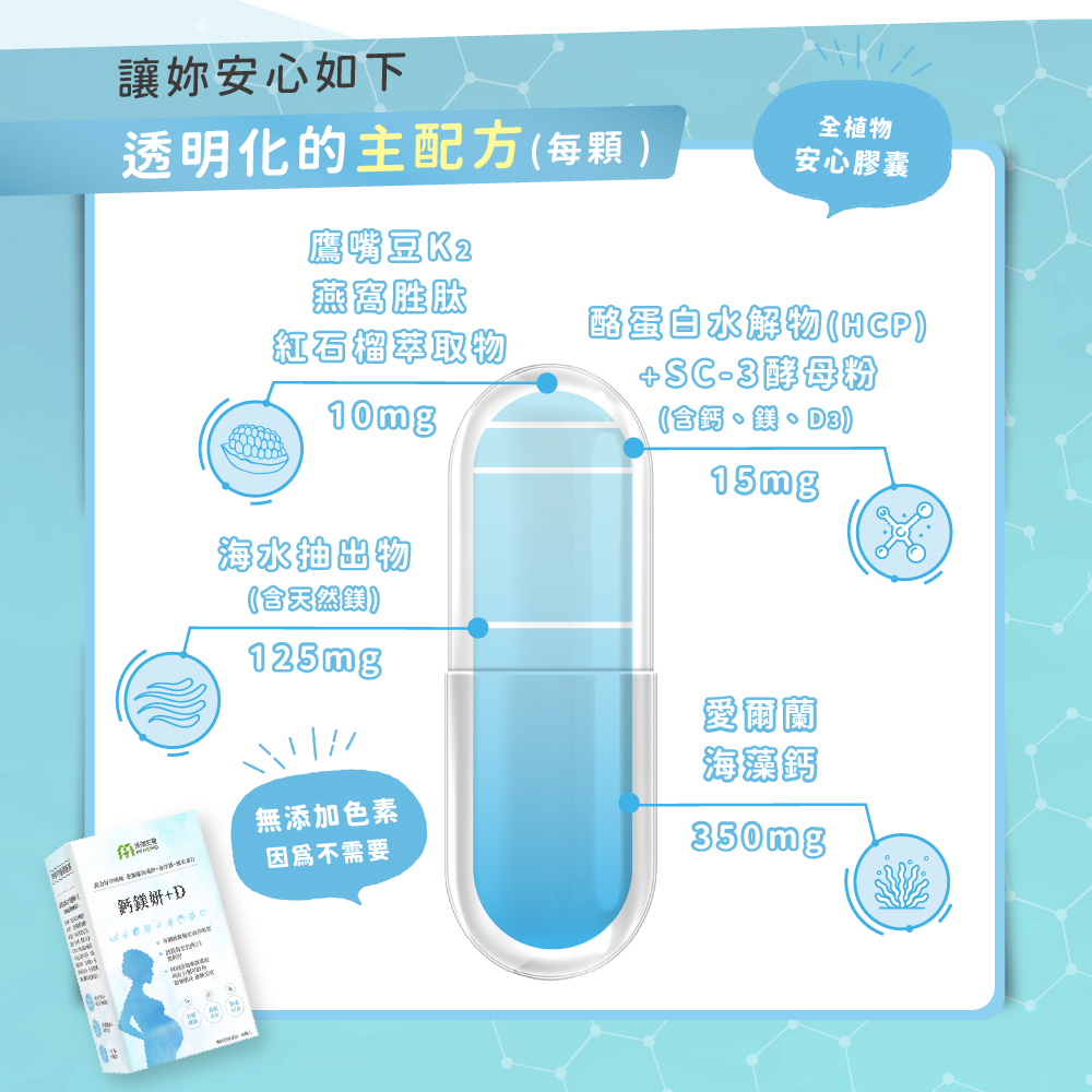 商品成份:愛爾蘭海藻鈣(含天然鈣)、海水抽出物(含天然鎂)、酪蛋白水解物(CPP)、SC-3超鈣酵母粉(含鈣、鎂、D3)、酵母K2、紅石榴萃取物、燕窩胜肽