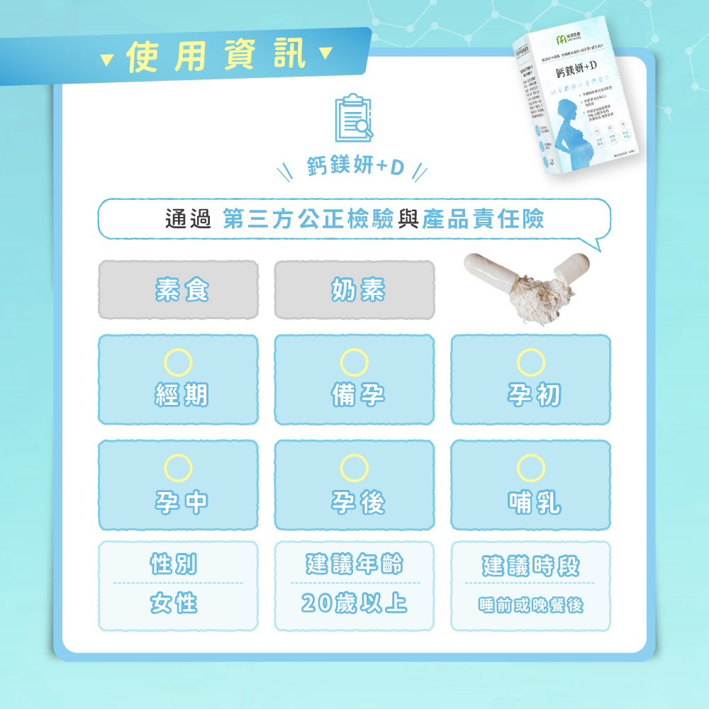 全面照顧媽咪懷孕期間及生產後所需要的營養補給。素食也能食用,讓素食媽咪好安心~