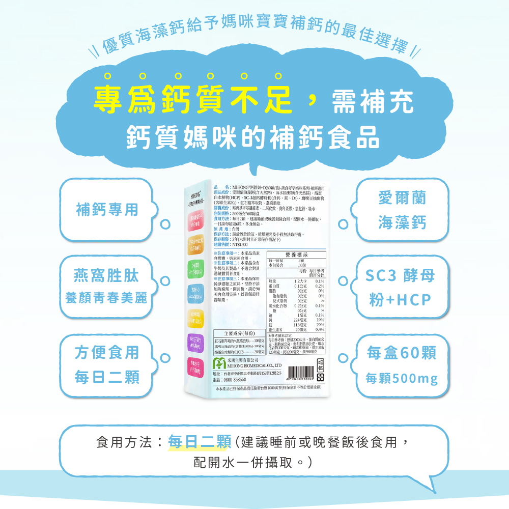 商品名稱:MIHONG® 鈣鎂妍+D(60顆/盒) - 蔬食好孕媽咪系列 - 補鈣適用