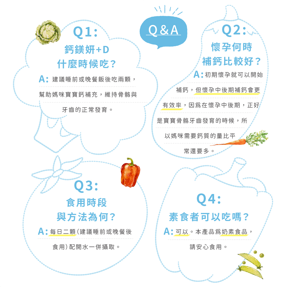 A:建議睡前吃兩顆,幫助媽咪寶寶鈣補充,維持骨骼與牙齒的正常發育。