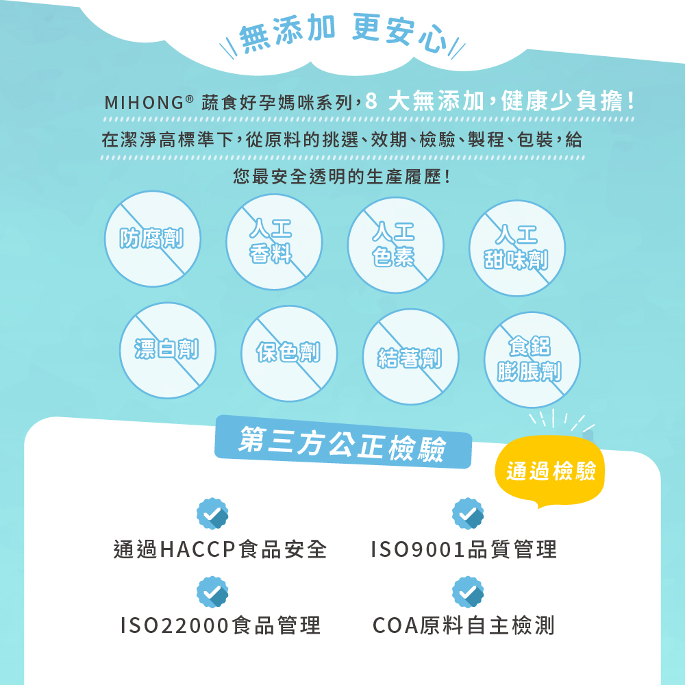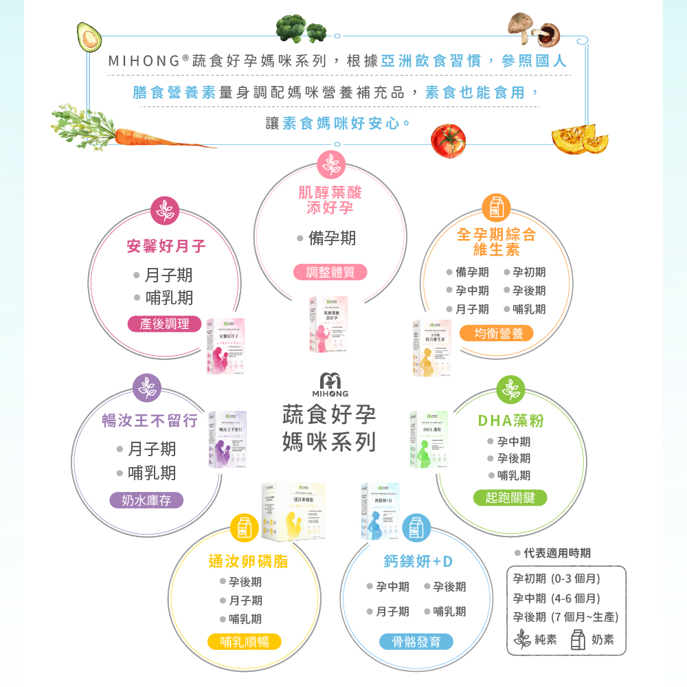 ?MIHONG®蔬食好孕媽咪系列,根據亞洲飲食習慣,參照國人膳食營養素量身調配媽咪營養補充品,素食也能食用,讓素食媽咪好安心。