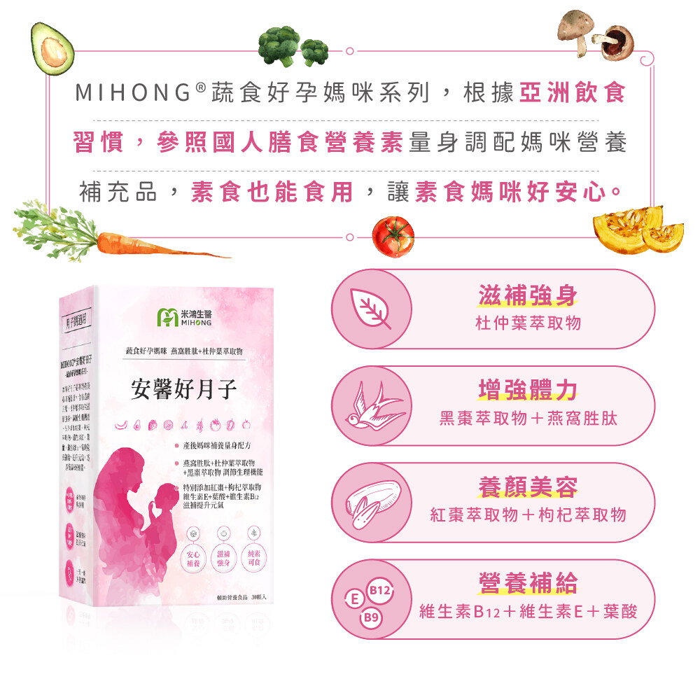 商品名稱:MIHONG® 安馨好月子(30顆/盒) - 蔬食好孕媽咪系列 - 月子期適用
