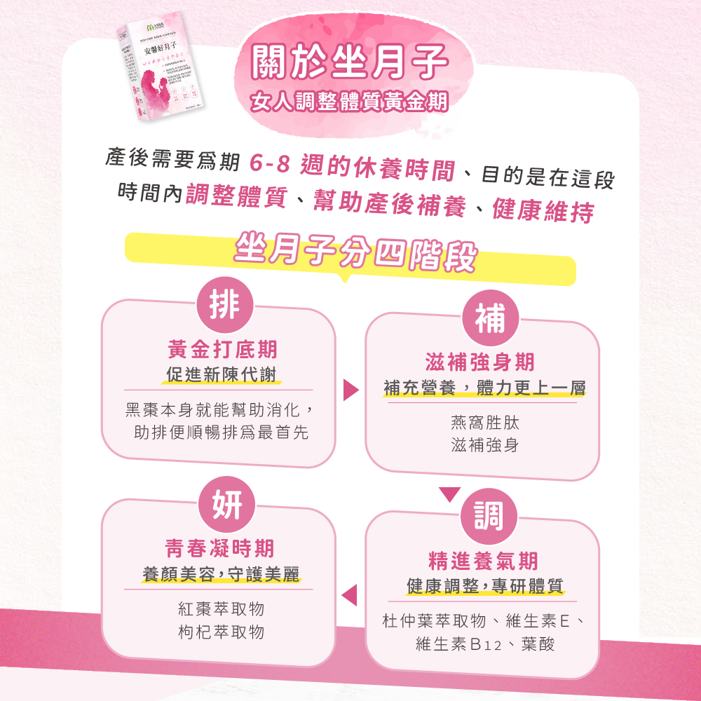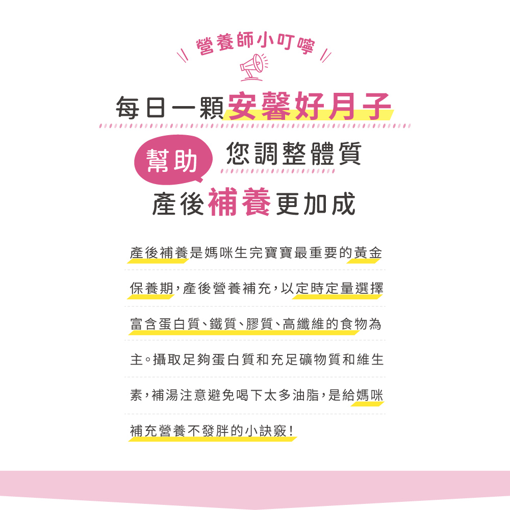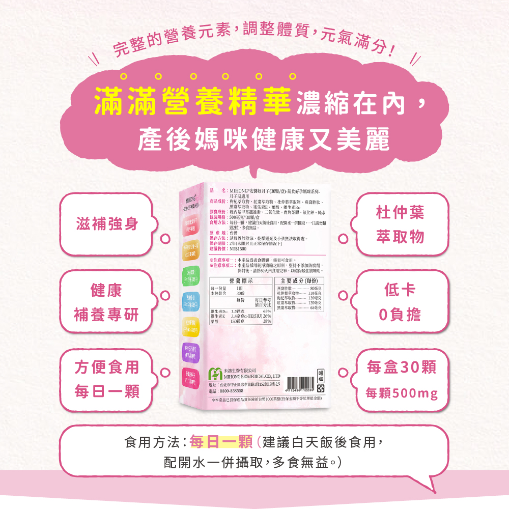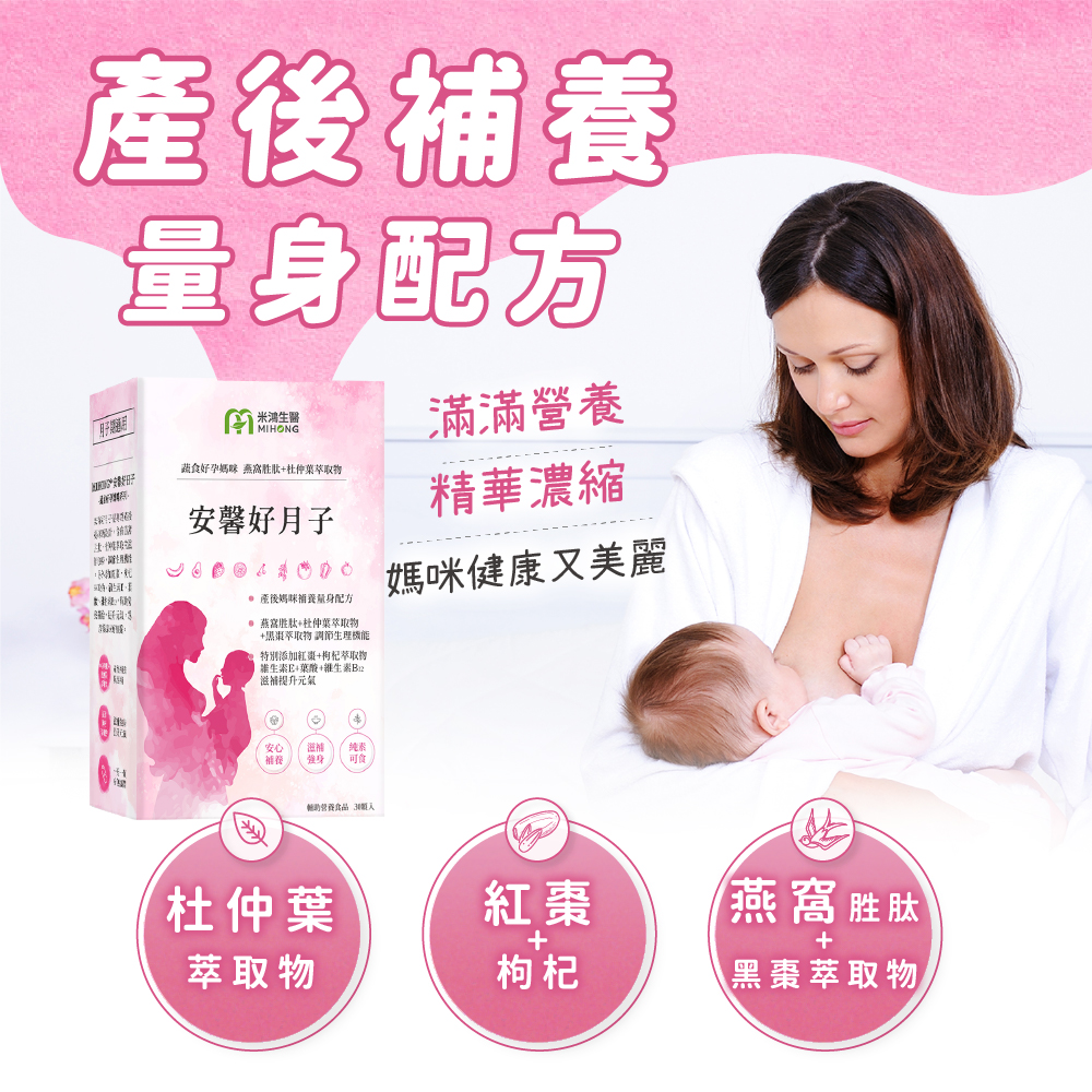 ?MIHONG® 安馨好月子(30顆/盒) - 蔬食好孕媽咪系列 - 月子期適用,把握黃金時期,研製漢方草本精華以及添加燕窩胜肽,讓媽咪產後補養,養顏美容。