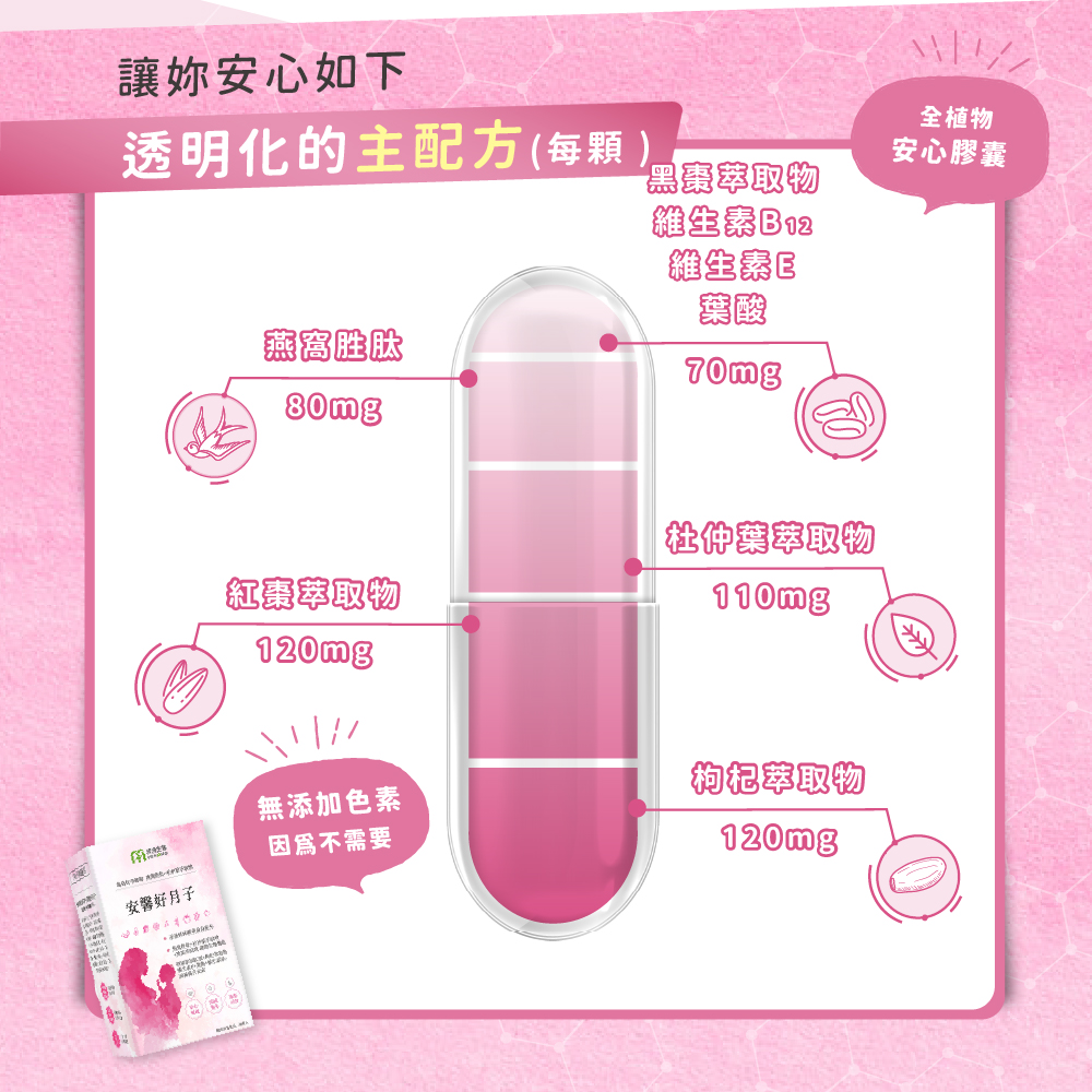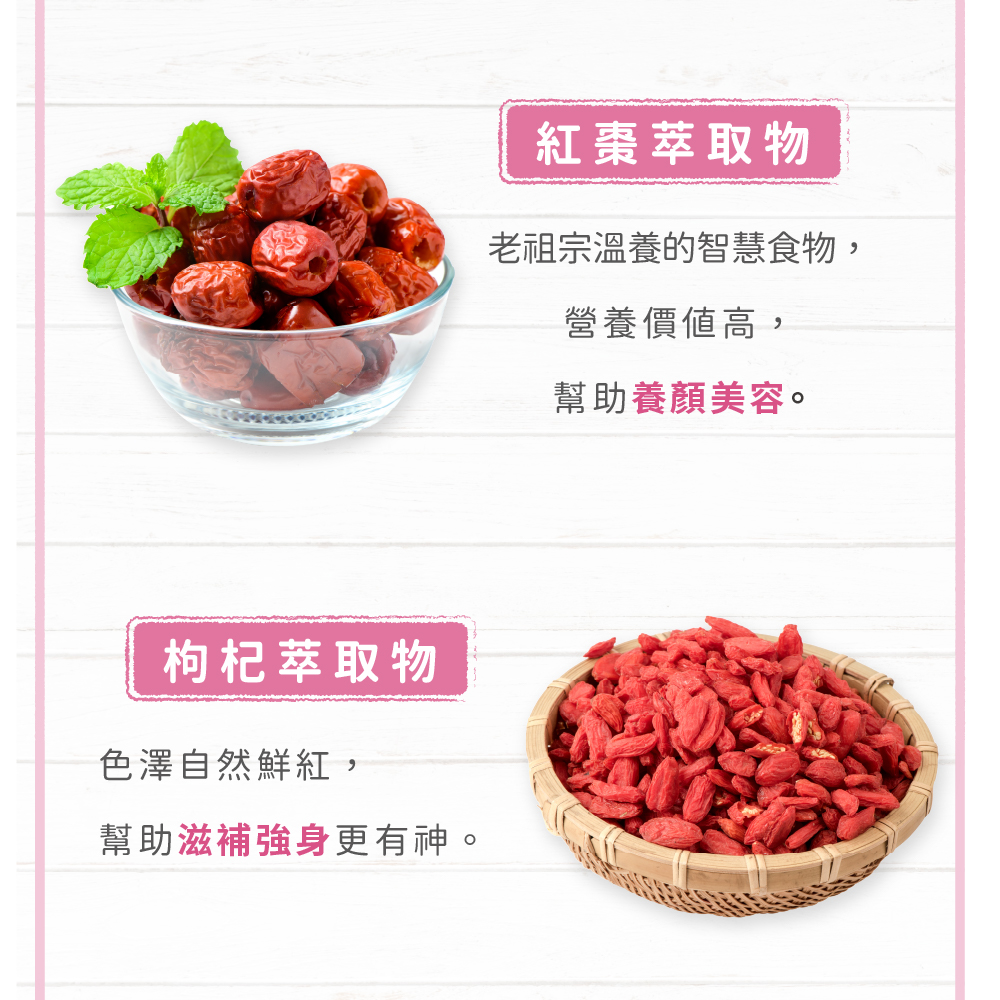 商品成份:枸杞萃取物、紅棗萃取物、杜仲葉萃取物、燕窩胜肽、黑棗萃取物、維生素E、葉酸、維生素B12