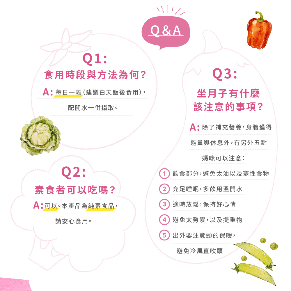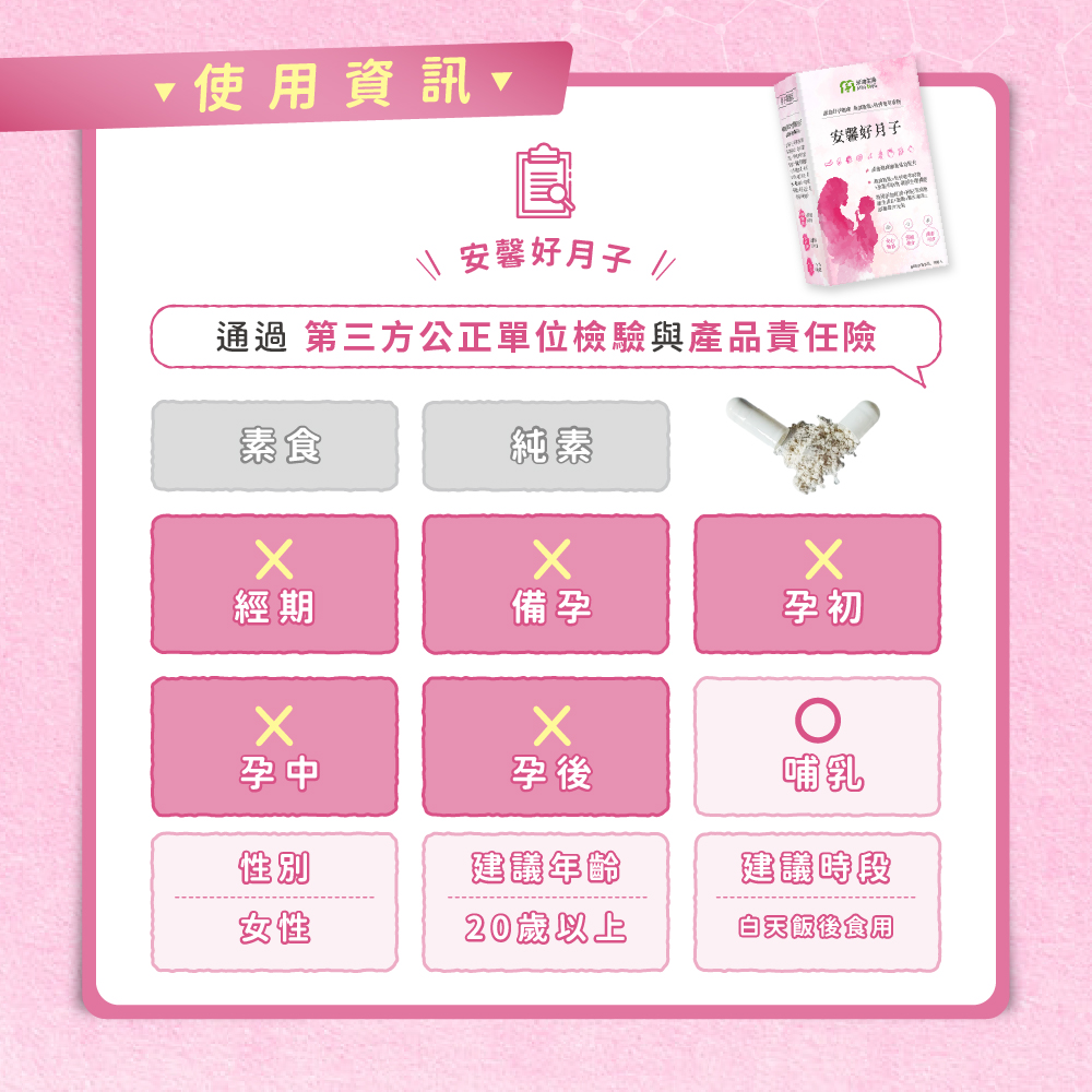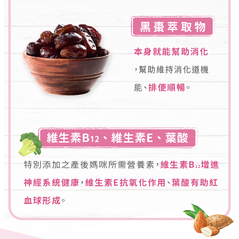 全面照顧媽咪懷孕期間及生產後所需要的營養補給。素食也能食用,讓素食媽咪好安心~