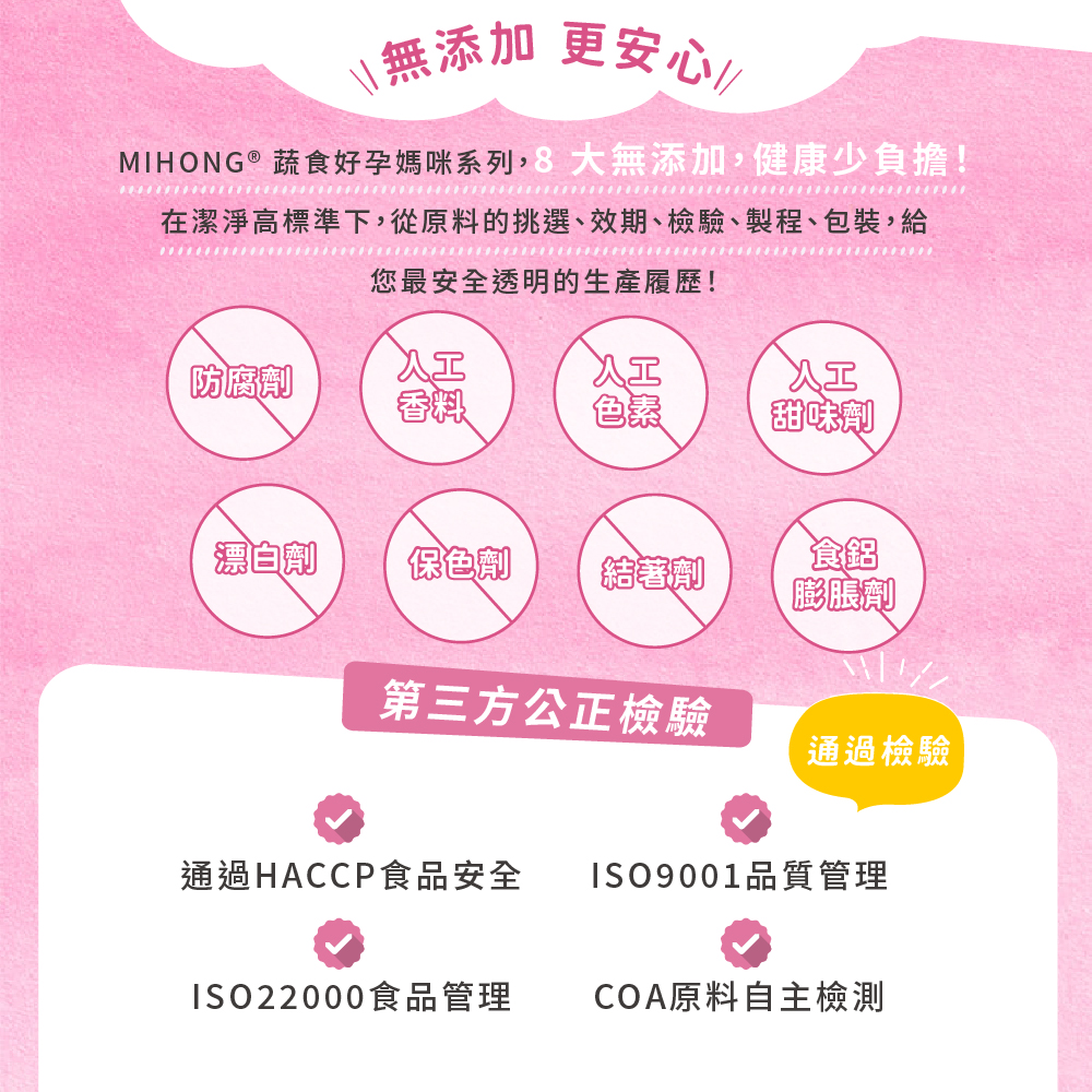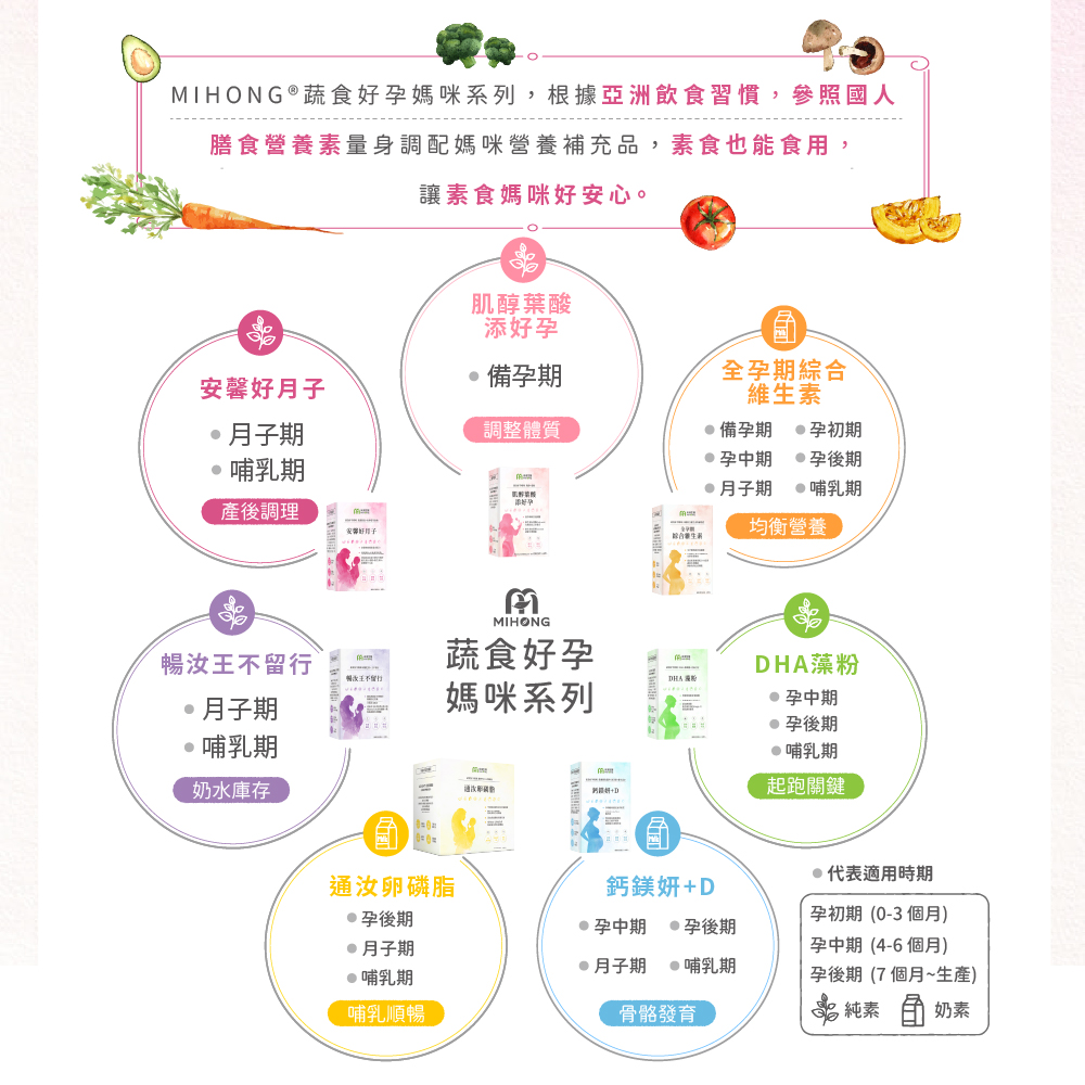 ?MIHONG®蔬食好孕媽咪系列,根據亞洲飲食習慣,參照國人膳食營養素量身調配媽咪營養補充品,素食也能食用,讓素食媽咪好安心。