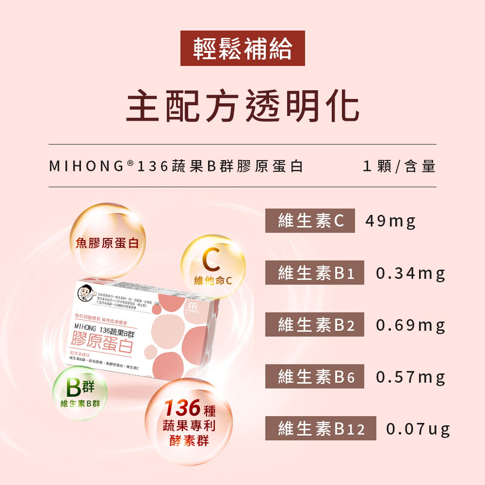 膠原蛋白、綜合蔬果發酵物{綜合蔬果發酵粉-A{鳳梨萃取粉、鳳梨酵素、綜合蔬果發酵粉〔白蘿蔔、胡蘿蔔、山藥、山芹菜、蕹菜、青花菜、芹菜、芥菜、結球萵苣、劍葉萵苣、高麗菜、半結球萵苣、球莖甘藍、茄子、青椒、小黃瓜、花胡瓜、南瓜、山苦瓜、茼蒿、結球白菜、油菜、蚵白菜、長豇豆、扁蒲、紅鳳菜、玉米筍、青辣椒、紫地瓜葉、綠地瓜葉、菠菜、野莧菜、牛蕃茄、秋葵、紅甘薯、冬瓜、大心菜、甜菜根、紫高麗菜、生薑、甜瓜、西瓜、青木瓜、新疆哈密瓜、洋香瓜、蕃茄、鳳梨、葡萄柚、柳橙、柑橘、茂谷柑、番石榴、葡萄、香蕉、波蘿蜜、火龍果、日本蜜柑、青梅、白葡萄、桑椹、蜜棗、檸檬、蜜梨、杏鮑菇、金針菇、鮑魚菇、香菇、黑木耳、胡蘿蔔葉、五葉松、咸豐草、石蓮花、仙人掌果、花生莖、淡竹葉、東印度羅勒、辣木葉、破布子、枸杞、薄荷葉、香蘭、魚腥草、迷迭香、芫菜、芭樂葉、乳糖、玉米澱粉〕、蘋果醋粉、諾麗果發酵粉、西印度櫻桃、草莓、藍莓、巴西莓、洋蔥、木瓜、澱粉酵素、蛋白酵素、解脂酵素}、麥芽糊精、綜合蔬果粉〔砂糖、麥芽糊精、蘋果、鳳梨、紅蘿蔔、橘子、蕃茄泥、氧化澱粉(樹薯)、檸檬酸、香料、檸檬酸鈉、β-胡蘿蔔素、婀娜多色素〕、無水葡萄糖、抹茶粉、諾麗果發酵粉、綜合消化分解酵素〔木瓜酵素、蛋白酵素、乳糖酵素、解脂酵素、澱粉酵素、纖維分解酵素、鳳梨酵素〕、綜合蔬果發酵粉-B [綜合蔬果粉A(麥芽糊精、蘋果、梨子、奇異果、辛烯基丁二酸鈉澱粉、胡瓜汁、芹菜汁、菠菜汁、白菜汁、鳳梨、檸檬、百香果、黃槴子色素、槴子藍色素)、麥芽糊精、綜合果汁粉〔砂糖、麥芽糊精、綜合水果(百香果、鳳梨、橘子、香蕉、蜜柑、芒果、木瓜、萊姆、檸檬、蘋果、白葡萄、水蜜桃、藍莓、西印度櫻桃、紅葡萄)、檸檬酸、檸檬酸鈉、香料、蘋果酸、β-胡蘿蔔素〕]、綜合蔬果發酵粉-C(麥芽糊精、鳳梨、番茄、葡萄、梅子、番石榴、檸檬、葡萄柚、甜橙、椪柑、胡瓜、南瓜、絲瓜、冬瓜、苦瓜、紅蘿蔔、地瓜葉、小黃瓜、大白菜、小白菜、高麗菜、青椒、芹菜、西洋芹、青江菜、巴西利、芥藍、豌豆、蘋果、百香果、青花椰菜、馬鈴薯、老薑、地瓜、甜菜根、山藥、香菇、空心菜、紅龍果、茼蒿、菠菜、甜椒、茄子、筊白筍、菜豆、敏豆、紅鳳菜、球莖甘藍、牛蒡、莧菜、萵苣、扁蒲、秋葵、金針菇、酵母菌、A菌Lactobacillus acidophilus、保加利亞乳酸桿菌Lactobacillus bulgaricus、胚芽乳酸桿菌Lactobacillus plantarum、嗜熱多醣鏈球菌Streptococcus thermophilus、嗜酸芽孢乳酸菌Sporolactobacillus inulinus、比菲德氏菌Bifidobacterium bifidum、凝結芽孢乳酸菌Bacillus coagulans、LP菌Lactobacillus paracasei、砂糖)、大麥苗粉、小麥苗粉、綜合蔬果發酵粉-D (玉米來源可溶性纖維、諾麗果、水蜜桃、荔枝、紅葡萄柚、紅葡萄、蘋果、石榴、番茄、柳橙、蔓越莓、草莓、覆盆莓、櫻桃、黑醋栗、醋栗、白葡萄、胡蘿蔔、百香果、鳳梨、檸檬、綠花椰菜、芹菜、蘆筍、藍莓、楊梅、桑椹)、洛神花萃取粉、山桑子萃取粉、山楂萃取粉、西洋牡荊萃取粉}、維生素C、微結晶狀α-纖維素、綜合維生素 B 群〔麥芽糊精、乳糖、核黃素、維生素 B6(鹽酸吡哆辛)、菸鹼醯胺、維生素B1(硝酸硫胺明)、維生素B12(麥芽糊精、檸檬酸鈉、檸檬酸、維生素 B12)、本多酸鈣、葉酸、生物素〕、二氧化矽