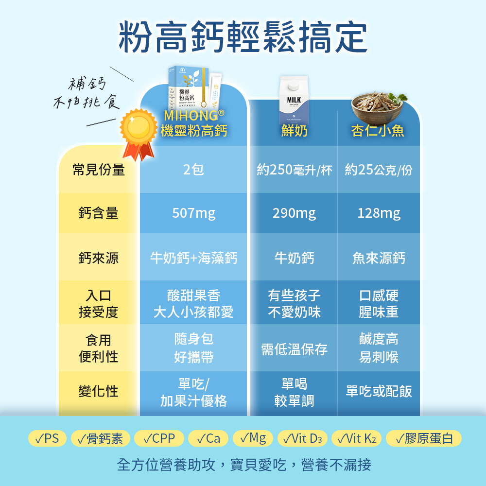 A: MIHONG®機靈粉高鈣特別添加成長配方,補鈣同時學習更順心!