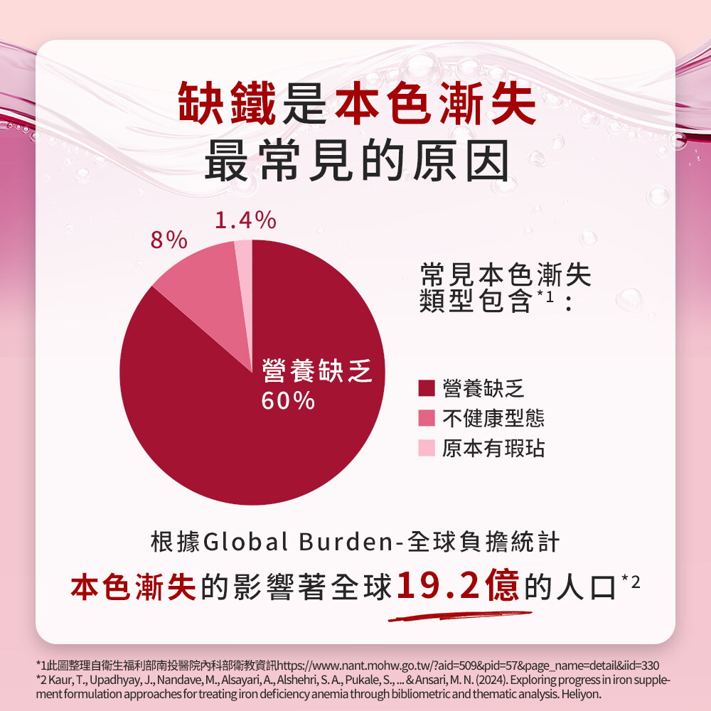 1.嚴選專利Ferrochel®複合甘氨酸亞鐵,聯合國推薦的世界頂級礦物質,也是構成血紅素重要成分,有助氧氣輸送利用。
